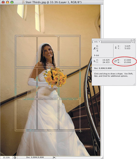 You’re going to need to see the exact size you want to crop down to, so go under the Window menu and choose Show Info. This brings up the Info panel (shown in Figure 3), which displays the Width and Height for any shape you draw. So now take the Custom Shape tool and drag out a grid, and as you drag, keep an eye on the Info panel’s Width and Height fields (our goal is to print a 13×19″ print, so we’re going to want our final grid size to be 13″ wide by 19″ tall). Now, start dragging. (Don’t worry about positioning the grid right yet — just keep your eye on that Info panel, and your wrist steady, so you can drag out exactly a 13×19″ grid. Also, don’t worry about damaging your photo — that’s why we created that new blank layer in Step One, so your grid will appear on this new layer.)