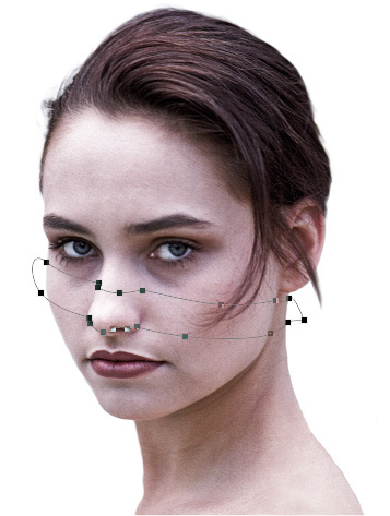 Make a new layer behind the front ribbon, and fill it with a tone sampled from the head. Draw the back half of the ribbons with the Pen tool, joining the left side of each front ribbon to the right side of the ribbon directly above it. Make a smooth, flowing series of curves, to accentuate the roundness of the head. Then choose Layer > Vector Mask > Current Path again, and the new layer will be visible only inside the drawn path.