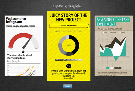 The process of creating an Infogr.am infographic is pretty simple. Start by choosing one of six pre-designed templates.