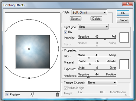 Go to Filter > Render > Lighting Effects and change the lighting Style to Soft Omni and the settings to those shown below: