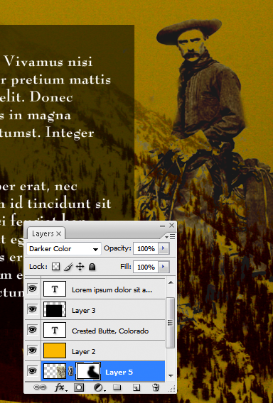 With the Marquee selection tool, draw a rectangular selection around the cowboy and horse. Switch to the Move tool and click-and-drag the selection onto the colorado.jpg file. Photoshop automatically places the cowboy onto a new layer. Move this new layer to just above Layer 1 in the Layers panel. Change the Layer Blending Mode to Darker Color and move the cowboy to the right as shown below.