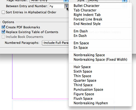 TOCs need a divider to separate an entry from its page number. The default is a tab character, written as ^t. You can use the drop-down menu to choose a special character, such as an em dash, forced line break, and so on (Figure 13). My favorite is to change the tab to a right indent tab (^y). This forces the page number all the way to the right side of the margin.