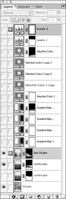 If you do start shifting images within their layers, be aware that you may need to duplicate image layers to support your variations. For instance, at one point when I changed the position of the clouds within a layer, I had to duplicate the layer containing the Layer Masks that interact with the clouds (see Figure 11). When the clouds are in one position the corresponding landscape and Layer Mask would be visible; when the clouds are in another position, you may wish to use the duplicate landscape so that you can rework that Layer Mask.