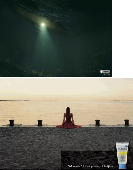 Figure 5. Water is also a common projection of the subconscious. The first of these two adverts metaphorically travels into the depths of the mind to reveal shadowy secrets. The second ad uses an image of water to convey a feeling of well-being.