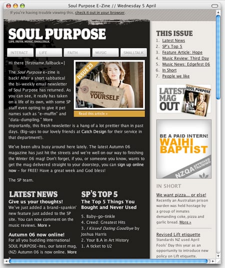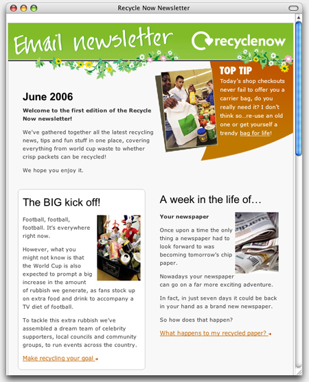 Figure 1. The Campaign Monitor site includes samples of e-mail templates that have been designed by others and processed by Campaign Monitor. Here, you see examples of newsletters from UK-based Recycle Now (top) and New Zealand youth culture magazine Soul Purpose (bottom).