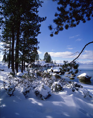 Use the available light. Light is scarce in the winter, so if you have the good fortune of dramatic lighting, seize the chance to get some interesting shots. Look for low angle light to create long, contoured shadows or use backlighting to set up a silhouette. Figure 4 shows a mix of silhouetted tree branches on a bright blue sky with the low shadows cascading over the snow and rocks, making for a dramatic, textured shot.