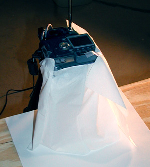The first light tent setup we’ll build involves nothing more than your camera, some tape, and a couple facial tissues. Set your camera up on your tripod to minimize camera movement, and then place your object on a white sheet of paper to provide a neutral background and minimize reflections. Next, position your camera over the object and tape the tissue around the lens to form a tent over the object, as shown in Figure 2. The result is an instant improvement over our first attempt, as shown in Figure 3.