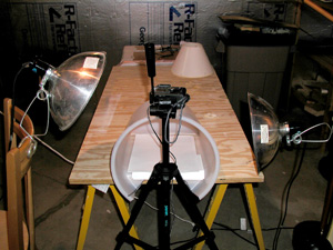 Figure 8: We used inexpensive clamp reflectors to direct our light at the light tent. Note that they’re placed at different levels to vary the light angles.