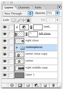 However, though this image might be a throw-back to traditional photo collage, it’s still firmly rooted in the digital world thanks to her use of transparency for different layers in the collage. By sticking each photo in a separate layer in Photoshop (and in some cases, grouping layers into Layer Sets), she was able to alter the transparency of each separate image (see below).