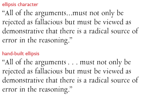 Nevertheless, the ellipsis character isn’t a total loss. It can be useful in display type, because spaces look bigger when set in large point sizes. The result is that an ellipse that’s ineffective at text size can look properly proportioned when set very large. But again, if you use a period with the ellipsis character in display type, pay close attention to the kerning between the two, as any variation in spacing among the four dots will be magnified just that much more.