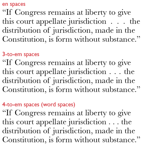 The revered manual Words into Type, for example, recommends en spaces. The Chicago Manual of Style prescribes closer spacing, using one-third em spaces (a.k.a. three-to-the-em spaces). Oxford University Press’s Hart’s Rules prefers “spaces of the line,” which is to say, the equivalent of word spaces.