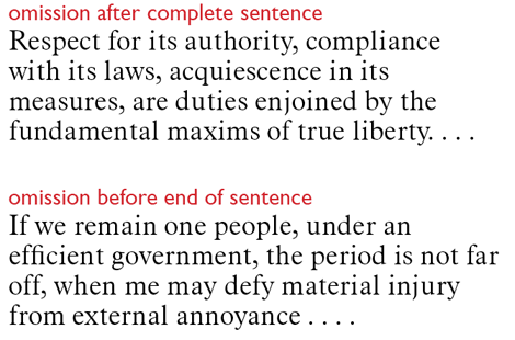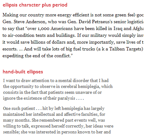 In these online samples, the ellipsis-plus-period in the upper text block is not a pretty sight. As the properly constructed ellipses in the lower sample show, this doesn’t have to be the case.
