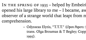 The type family also includes a handful of ornaments and two bolder weights (with their italics)—Bold and Black. There are no italic small caps. (This is a traditional omission, but it invariably gets a designer in trouble when the design calls for small caps but the text calls for a word or title in italics.)