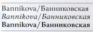 Not surprisingly, the Latin complements to Cyrillic typefaces aren’t always as noteworthy. Bannikova, a text and display family that ParaType’s catalog describes as “one of the best original typefaces of Soviet typography,” is clearly more interesting in Cyrillic than in Latin. The Cyrillic looks noticeably darker on the page, and it has a more distinctive character because of the many little details along the x-height and the baseline, where the more rounded Latin lowercase doesn’t have so many strokes to work with. The design was inspired by both 18th-century Russian type and the humanist types of the Renaissance—a creatively mixed heritage. Bannikova was originally designed at Polygrafmash in 1946-51 by Galina Bannikova; it was revised and digitized in 2001 by Lyubov Kuznetsova (who also digitized New Journal).