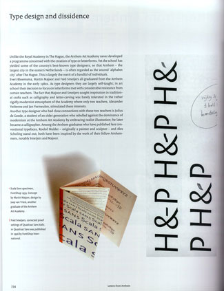 Another art school has had an influence through its students, though the Arnhem Art Academy never had the concentrated focus on type design that the Royal Academy did. Yet three of the best-known modern Dutch type designers all graduated from Arnhem in the early 1980s: Fred Smeijers, Martin Majoor, and Evert Bloemsma. Their work, too, is grouped together in the book and given plenty of room.