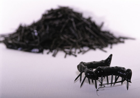Ezer’s letters not only take on three-dimensional forms; they take on very strange three-dimensional forms. Some of them sprout sharp, pin-like legs, which lift the letters off the flat surface, but also look as though they could stab into the surface, to hold themselves there. They look menacing, which is just what Ezer intends: “The ‘legs’ are there to give a threatening nature to the letter.” Other letters take on melted or distressed forms; they can look a little like plastic toy soldiers that some willful child has half-melted. And the letters often seem to be moving, as though they were alive.