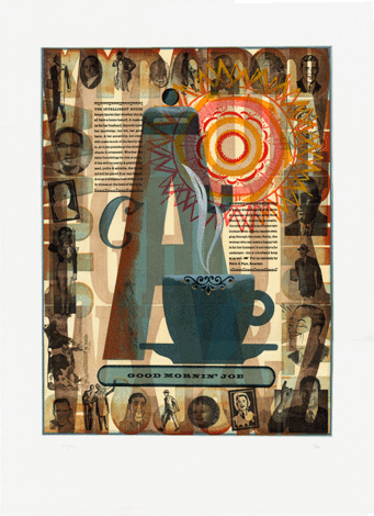 Figure 6: Letterpress print, “Good Mornin’ Joe,” by Chris Stern, using text from ads for a 19th-century coffee company and multiple layers of type and image.
