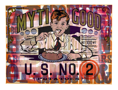Figure 7: Letterpress print, “Myti Good,” designed and printed by Chris Stern, incorporating 19th-century potato ads.