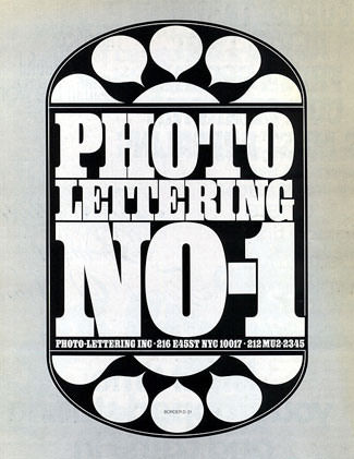 Photo-Lettering, the New York typesetting house that supplied headlines to much of the advertising and graphic-design business, both fed the appetite for new, ever-more-striking display typefaces and strove to keep ahead of the curve by stimulating the demand. Its library of typeface designs was huge, and growing daily. And, of course, one of the ways the company advertised its own business was through brochures, catalogs, and other publications that showed off their typefaces in action. One of these, a 24-page booklet called “Photo-Lettering No. 1” (also called, on the back, “Alphabet Directions Number Twenty”), came into my possession recently, and its pages are a reminder of what type could look like in those days.