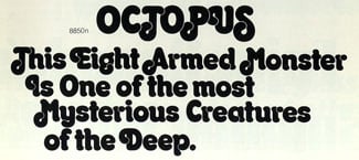 Sometimes there’s a typeface that seems to have one and only one proper use. Could anyone find another use for the face shown in this headline (identified here as “8850n”)? In what other context could those flailing swashes be appropriate, except a headline about an octopus? (Well, perhaps one about earthworms.)