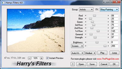 Harry’s Filters is very easy and comfortable to use. It can be applied to 8bit/channel RGB and Grayscale images. A Play button plays back random slider settings as animations. Frame rate and speed of the animation are adjustable. In addition to its entertainment value this feature lets you create interesting random effects and explore the possibilities of each filter effect. There is also a Jump button for producing random settings without an animation. Options for saving and opening effect presets allow the user to store his favorite effects and reuse them later. More than 120 presets are already delivered with the product. An instant preview check box animates the preview while a slider is dragged, which facilitates effect adjustments.