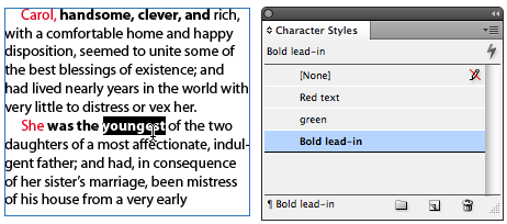The style entry “Bold lead-in” is highlighted, indicating the style has been manually applied (and so the text will export with the correct formatting). But notice how you still see the notation “Bold lead-in” in the bottom status area of the panel, next to a paragraph symbol, which is InDesign’s way of telling us the character style is being applied via a paragraph style.