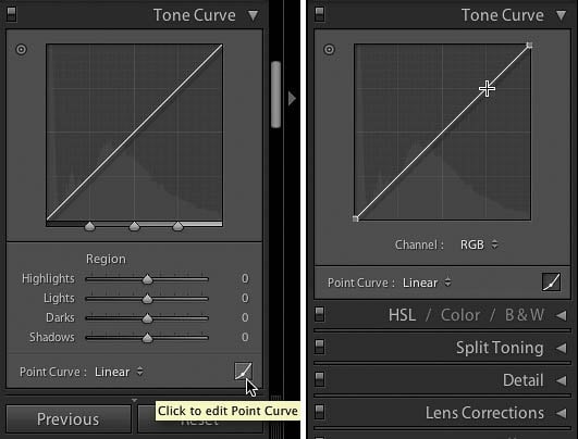 First we’ll try our old friend the point-based Tone Curve, the tone shaping tool of choice for the last quarter century in Photoshop. In Lightroom and Camera Raw, the Tone Curve has two modes, Parametric (sliders) and Point (points on the curve). The more Photoshop-like Point mode is hidden by default in Lightroom and Camera Raw, so to display the Point mode in Lightroom click the Point Curve button; in Camera Raw click the Point tab.