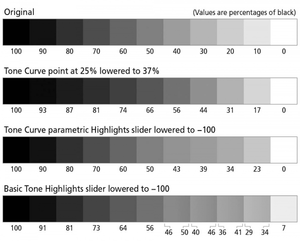 Where does that additional highlight detail come from? It’s easier to see the differences on a simplified gray scale, so I made one with 11 shades (white to black in 10% increments). Let’s compare the original gray scale to the results from the three adjustments we tried. In the gray scale for both Tone Curve examples, when a square gets darker the entire shade darkens equally, as we’d expect. But in the gray scale from the Basic Tone Highlights slider, we see something much different: In the tonal range affected by the slider, each square is not the same shade all the way across. The values actually change across the square! Looking closer, there is a method to this: The value of a shade changes faster as it approaches its border with another shade.