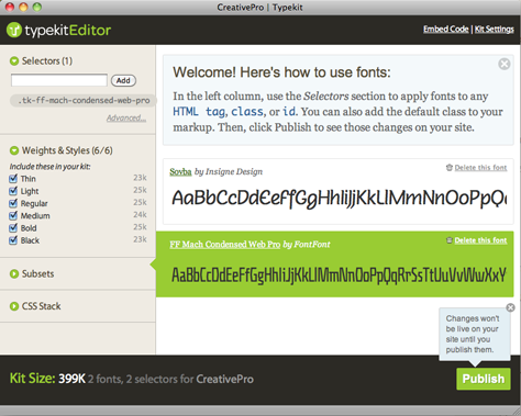 6. Publish your kit. After you’ve collected the fonts you want to use, click the Publish button in the lower right corner of the Kit Editor. This updates the Typekit service with your fonts and settings. This step is very important — if you forget to publish your kit, you won’t have access to the fonts in it.
