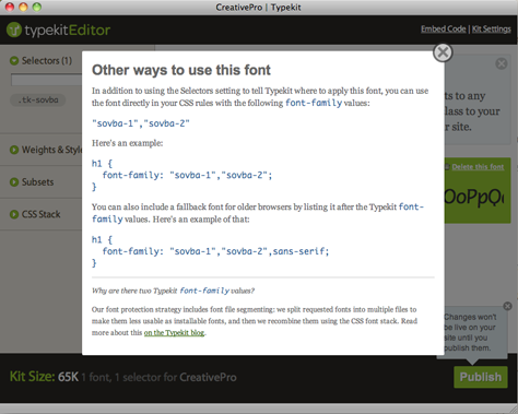 Figure 7. Clicking the “Advanced” link in the top left of the Kit Editor window opens this window, which describes how to use the CSS Font-Family property with the selected font. In this example, you need to add font-family: “sovba-1”, “sovba-2”; to any style that you wish to use this font with. You must use both names supplied. (To prevent piracy of the fonts, TypeKit splits them into two different fonts.) Click on the image to see a larger version.