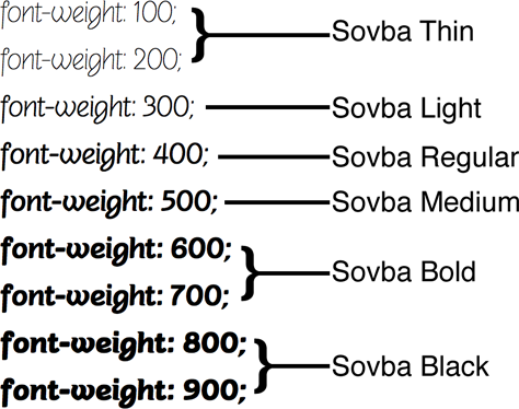 Some fonts include multiple weights, such as Light, Medium, Black. If that’s the case, and you’ve added those weights to your kit, you can use numeric values for the font weight. Valid values are 100, 200, 300, 400, 500, 600, 700, 800, 900. So to display the H1 tags using the Thin version of Sovba, you’d need to add the Thin version to your kit and then use CSS code like this: