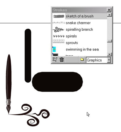 A skeletal stroke can be a natural-media stroke such as watercolor, ink splatters, a string of jellybeans, or even an animated giraffe. You can define areas of a skeletal stroke that repeat and produce a train with an infinite number of cars or create a stroke with multiple facets and produce a random assortment of different-colored flowers. At any time, the skeletal stroke can be altered and the path itself can be edited or assigned a different attribute. And make no mistake, these are not the inflexible “natural media” pens you see in Illustrator and CorelDraw. They are infinitely mutable and behave more like Painter brushes than vector paths.