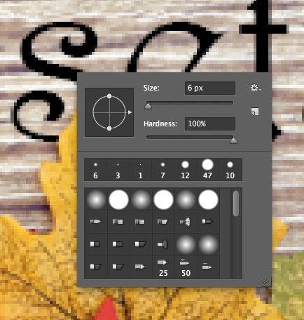 The square bracket keys [ and ] decrease/increase the brush size. And Shift+ the square bracket keys will decrease/increase the Hardness of the brush. In this case, I wanted a hard edge and a relatively small round brush to follow the edges of the leaf.