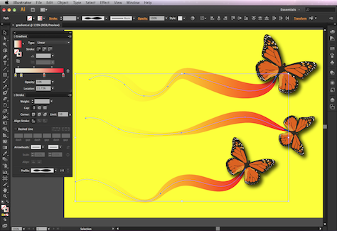 The second new feature, a long standing requested feature by users, is the ability to apply gradients on strokes. Take a look inside the CS6 Gradient panel, and you will find a series of new buttons that allow you to apply a gradient within, along, and across the strokes of selected objects. With the possibility to apply variable width to strokes introduced in previous release, the creative possibilities are endless.