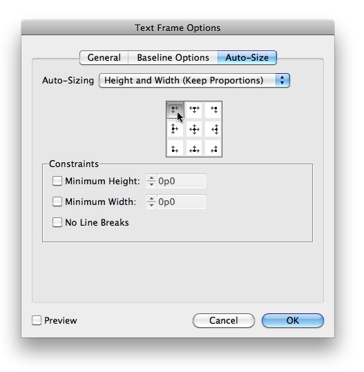 Text frames can now be made to resize automatically to fit the content within them. This is great for adapting layouts, but it’s also useful just when editing or reformatting text.