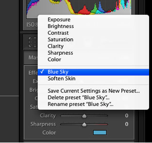 Figure 2. The Effect drop-down menu. Note that I’ve saved the Blue Sky adjustments from the Graduated Filter how-to above.