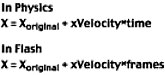 In Flash, because we calculate a new position every frame, the value used for frames is always 1. The initial position in this equation is always where the object was in the previous frame. By replacing time in the first equation in the figure with frames, we arrive at the second equation in the figure.