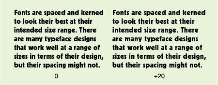 Figure A. When using a very heavy font for small sizes, such as Kabel Black shown below, readability will be greatly improved by opening the tracking. The setting on the left has no tracking, while the one on the right is set at +20 tracking.