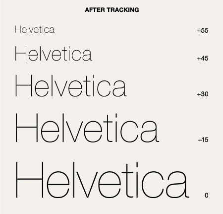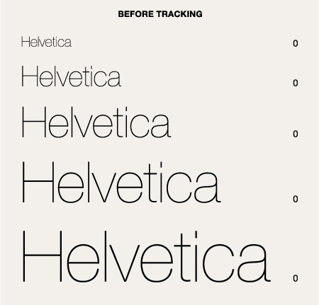 How much to track? Every font is different, and the tracking value will change depending on how far the type size deviates from its intended range. But it should be a gradual, progressive, and subtle change so that the spacing of all sizes appears to be the same, with the tracking adjustment almost invisible to the eye.