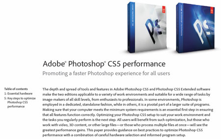 Released just last week by the Photoshop Performance Team, this PDF whitepaper will help you make the most of Photoshop CS5, squeezing the last drop of performance and speed from it. The whitepaper explains the differences between Photoshop running on 32-bit and 64-bit computers. It also helps you optimize your RAM, graphics processor, and CPU(s) to get the most power and fastest response from Photoshop CS5, and demystifies best practices for working with Scratch Disks and disk caches.