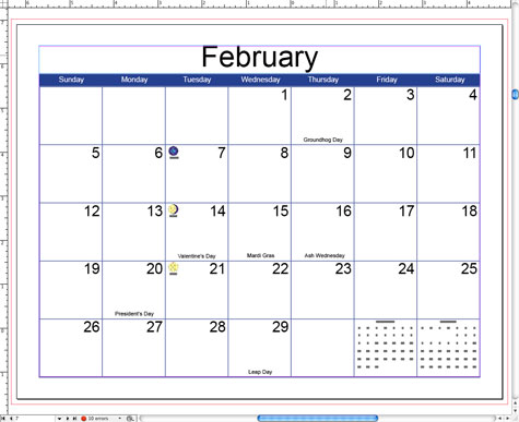 Last, there’s the venerable Adobe InDesign Calendar Wizard, a Javascript extension that builds a calendar for you based on copious options in the wizard’s dialog box. There are a bevy of formatting and layout options: Calendar Wizard lets you create one-page calendars; 12-month calendars on single or multiple pages; calendars with pictures in cells; previous and next month mini-calendars in unused cells; and calendars with holidays and/or moon phases pre-populated.