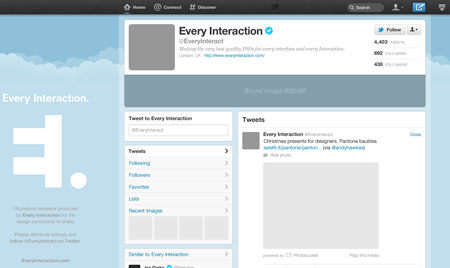 First is a pair of free Photoshop PSD templates from Jon Darke of Every Interaction for Twitter profiles. These excellent templates are 100% pixel-accurate to Twitter’s new profile layout and include easily customized vector objects and components arranged in logical groups and layers. There are even two different versions: one for personal profiles and another for Twitter’s new “enhanced” profiles for brands and advertisers. The templates are compatible with Photoshop CS4 and later.