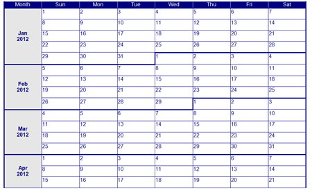 For total control over the look and style of a 2012 calendar you’ll need to turn to a page-layout program. There are plenty of free InDesign calendar resources. Let’s start with Nikolay Dimitrov’s, which is a Monday — Sunday European style template. Nikolay’s template is available as an INX file, which can be opened by InDesign CS3 and all later versions.