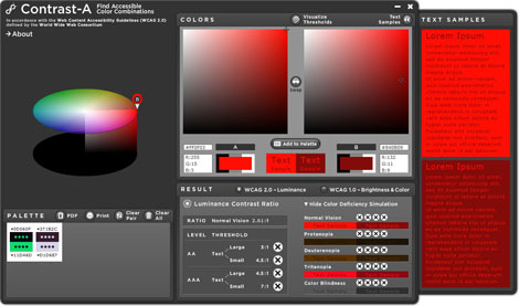 Although built for Web designers, the cross-platform AIR application Contrast-A is valuable in all design professions that use color. Contrast-A helps you understand and choose an appropriate level of contrast between two colors, particularly in light of common vision impairments. For example, is there sufficient contrast for your foreground and background colors to be easily discerned by anyone with deuteranopia (the most common form of red-green color blindness)? A 3D color model and various swatches will help you find out. Click the image below to see a larger version.