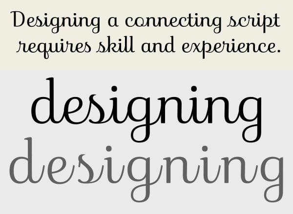 Insouciant, designed by James Montalbano of TerminalDesign, is an example of a well thought out, and skillfully drawn script. Connecting scripts are some of the most difficult type designs to draw, as they require perfectly drawn connectors that flawlessly join with all other characters. The lower example shows the unconnected individual letterforms.