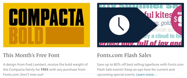 Monotype (fonts.com) offers a monthly free font with any purchase, as well as flash sales.