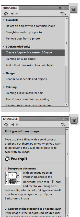 If you’ve installed Photoshop CS5, check it out — it now has a new feature, the Knowledge Panel (Window > Extensions > Knowledge). Not only does the Configurator-created panel deliver “knowledge” in the form of step-by-step 70, but these how-tos are interactive: Click a command in one of the tutorials, and Photoshop will do whatever the command says.