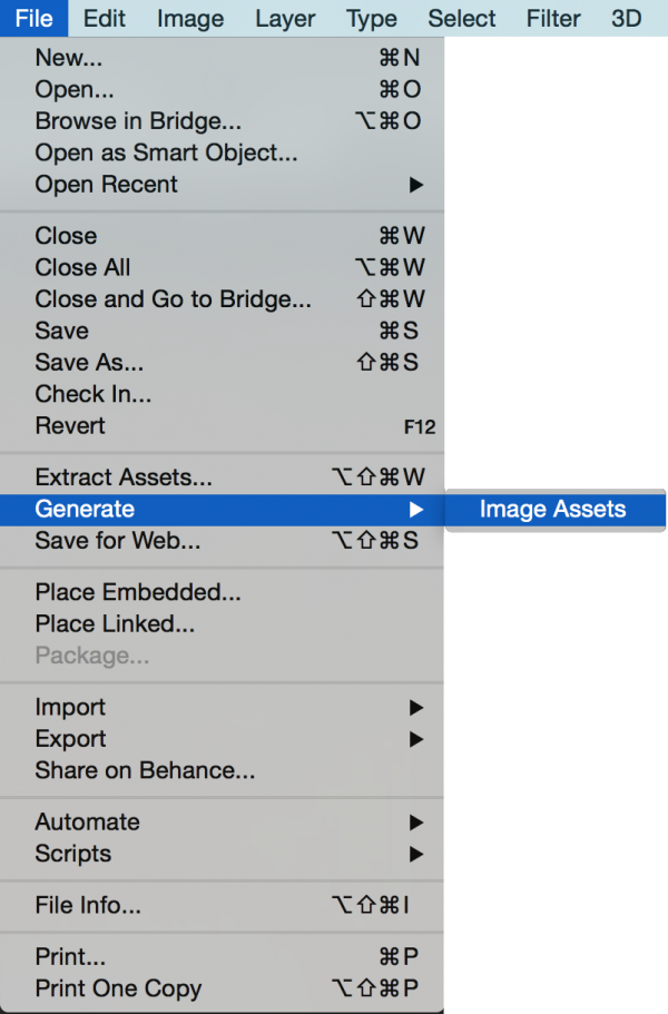 Now we need to tell Photoshop that we want it to generate image assets automatically based on the layers in our document. So choose File > Generate > Image Assets. Theoretically, this will create a new folder in the same folder where your .psd file lives that contains the automatically generated assets. However if you look there now, you won’t find anything. That’s because we haven’t defined any parameters that Generator can use to generate our assets.