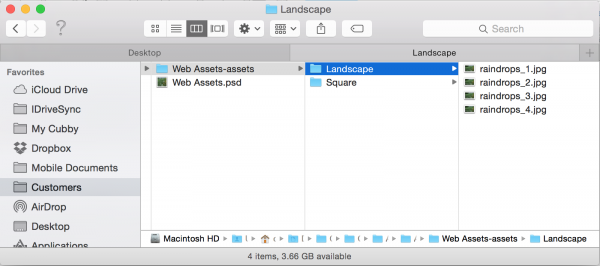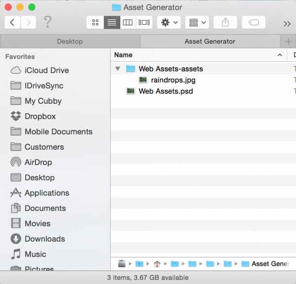 To get started, we’re just going to rename our layer as raindrops.jpg. Generator supports the .png, .gif, and .jpg formats, so whichever extension you use for the name of your layer, that is the format that will be created. Go ahead and look in the folder where your .psd document resides and you should notice a new folder with the same name as your .psd file with –assets appended to the end of it. Inside of that folder, you should see a jpg file at the same size as the layer in the .psd file.