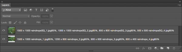 Now, we may want to get a little more specific by defining the quality as well as the specific size of the generated asset, so I’m going to change the name of the layer to 1500 x 1000 raindrops.jpg85%. When a unit of measurement is not specified, pixels is assumed but you can use any supported unit of measurement that you wish including in, cm, mm, etc. Yes, there is a space between the size parameter and the filename. This implicitly sets the size of the image as well as the jpg quality. You can adjust the quality as your requirements dictate. The important thing to remember at this point is that the asset has already been updated. No additional instructions are needed, no button to push, it’s done!